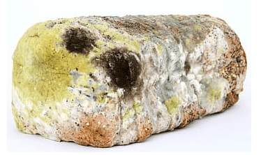 Rajah di bawah menunjukkan keadaan roti selepas dibiarkan selama 2 minggu. Apakah inferens tentang keadaan yang berlaku ke atas roti tersebut?